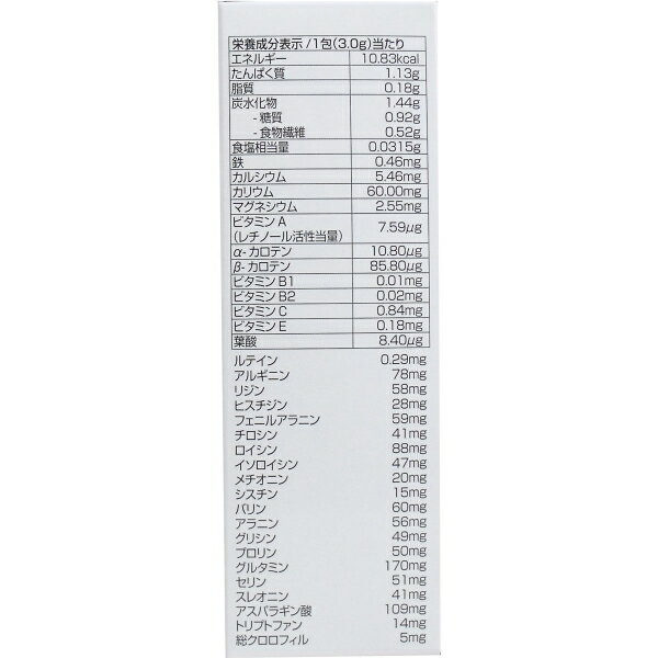 ギフトサービスについて 楽天国際配送対象店舗 (海外配送) Rakuten International Shippingマルマン株式会社個装サイズ:120X150X50mm個装重量:約103g内容量:3g×20包入ケースサイズ:50.2X34X33.4cmケース重量:約5.8kg製造国:日本【発売元:マルマン】【名称】大麦若葉加工食品【原材料】大麦若葉、えんどう豆ペプチドパウダー、米タンパク、還元麦芽糖水飴、抹茶(緑茶)、マルトデキストリン、サメ軟骨抽出末、チキンエキス末(鶏肉を含む)、鮭鼻軟骨抽出物(鮭を含む)/増粘剤(HPMC)、二酸化ケイ素、甘味料(アスパルテーム・L-フェニルアラニン化合物)【栄養成分(1包(3.0g)当たり)】エネルギー・・・10.83kcaLたんぱく質・・・1.13g脂質・・・0.18g炭水化物・・・1.44g(糖質・・・0.92g、食物繊維・・・0.52g)食塩相当量 0.0315g鉄・・・0.46mgカルシウム・・・5.46mgカリウム・・・60.00mgマグネシウム・・・2.55mgビタミンA(レチノール活性当量)・・・7.59μgα-カロテン・・・10.80μgβ-カロテン・・・85.80μgビタミンB1・・・0.01mgビタミンB2・・・0.02mgビタミンC・・・0.84mgビタミンE・・・0.18mg葉酸・・・8.40μg【お召し上がり方】1日1〜2パックを目安にお召し上がりください。