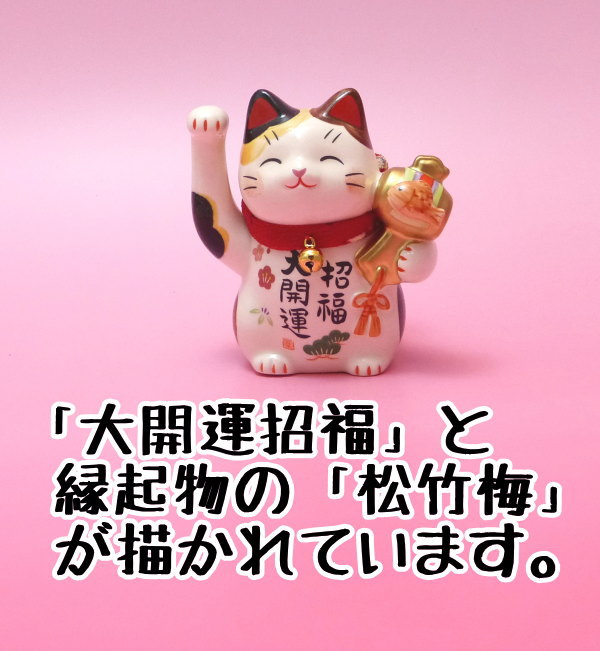 招き猫の特徴と飾り方 お腹に「招福大開運」と縁起物の松竹梅が描かれ、左手にはこれも縁起物の鯛が付いた小槌を持って、 右手で金運を招くというまさにおめでたいことは全部招く招き猫です☆